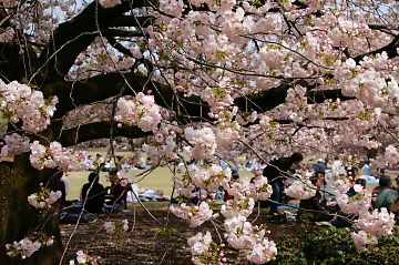 満開の八重桜の下で花見客。