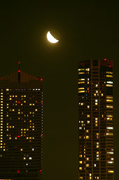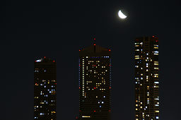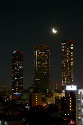 | ■阪神高速道路を走っているとき赤く大きな月が昇ってきた。 ■ビルと月のショットを撮りたくて、数少ないパーキングエリアに飛び込んでアングルを探した。 |