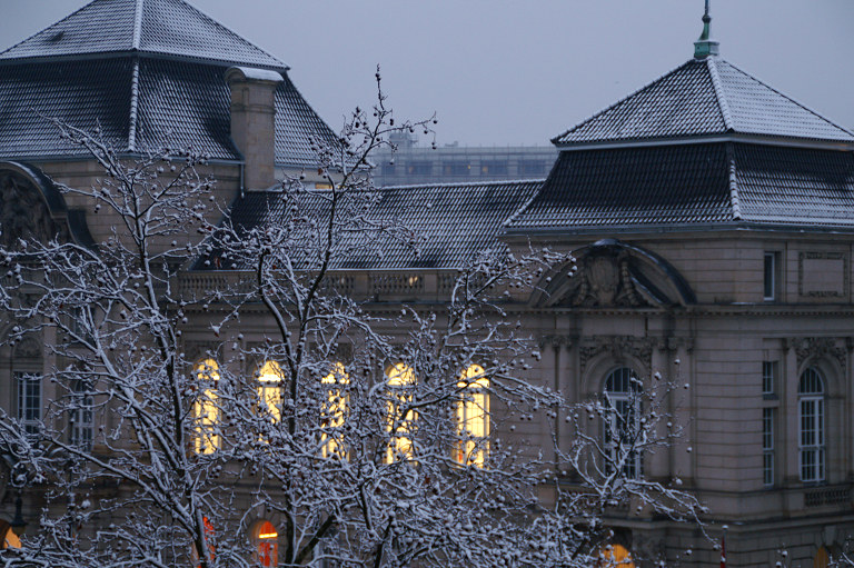 雪の朝、エクセルシオールホテルからの眺め。