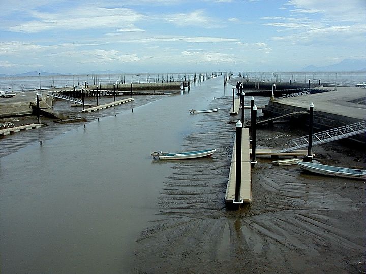 ■只江川河口の船着き場 近代的な船着き場です。干潮時ですが、ミオ筋がまっすぐに伸びて有明海につながっています。