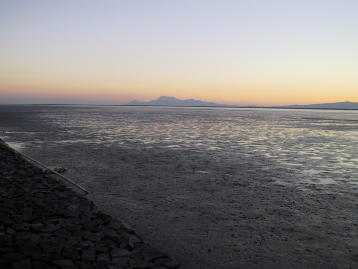 夕闇に入ろうとする雲仙普賢岳と干潟です。